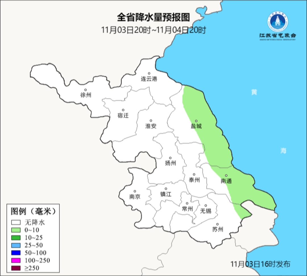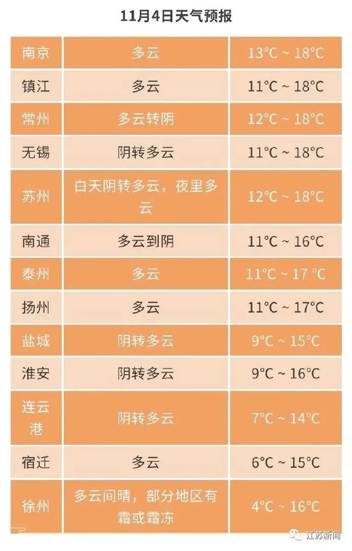 11月04日20时至11月05日20时:全省多云到晴。最高温度:全省16~17℃;最低温度:淮北地区5℃左右,苏南地区10~11℃,其他地区7~8℃。全省偏东风3-4级。