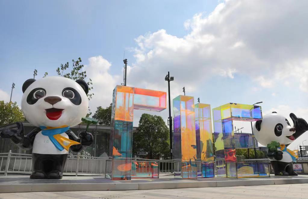 国家会展中心(上海)北入口外的进博主题装饰。新华社/图