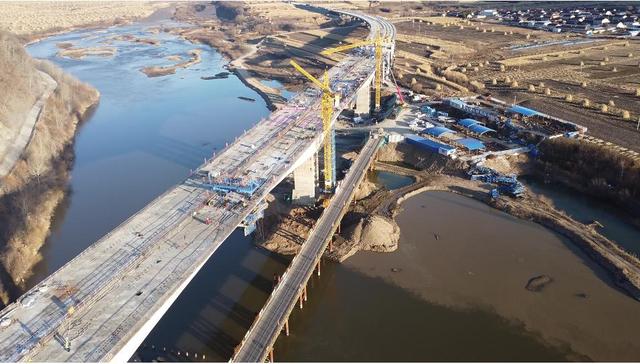 目前,东金沟松花江特大桥箱梁架设已经完成,现已进入T梁架设的冲刺阶段,接下来将全面推进桥面及附属工程施工。