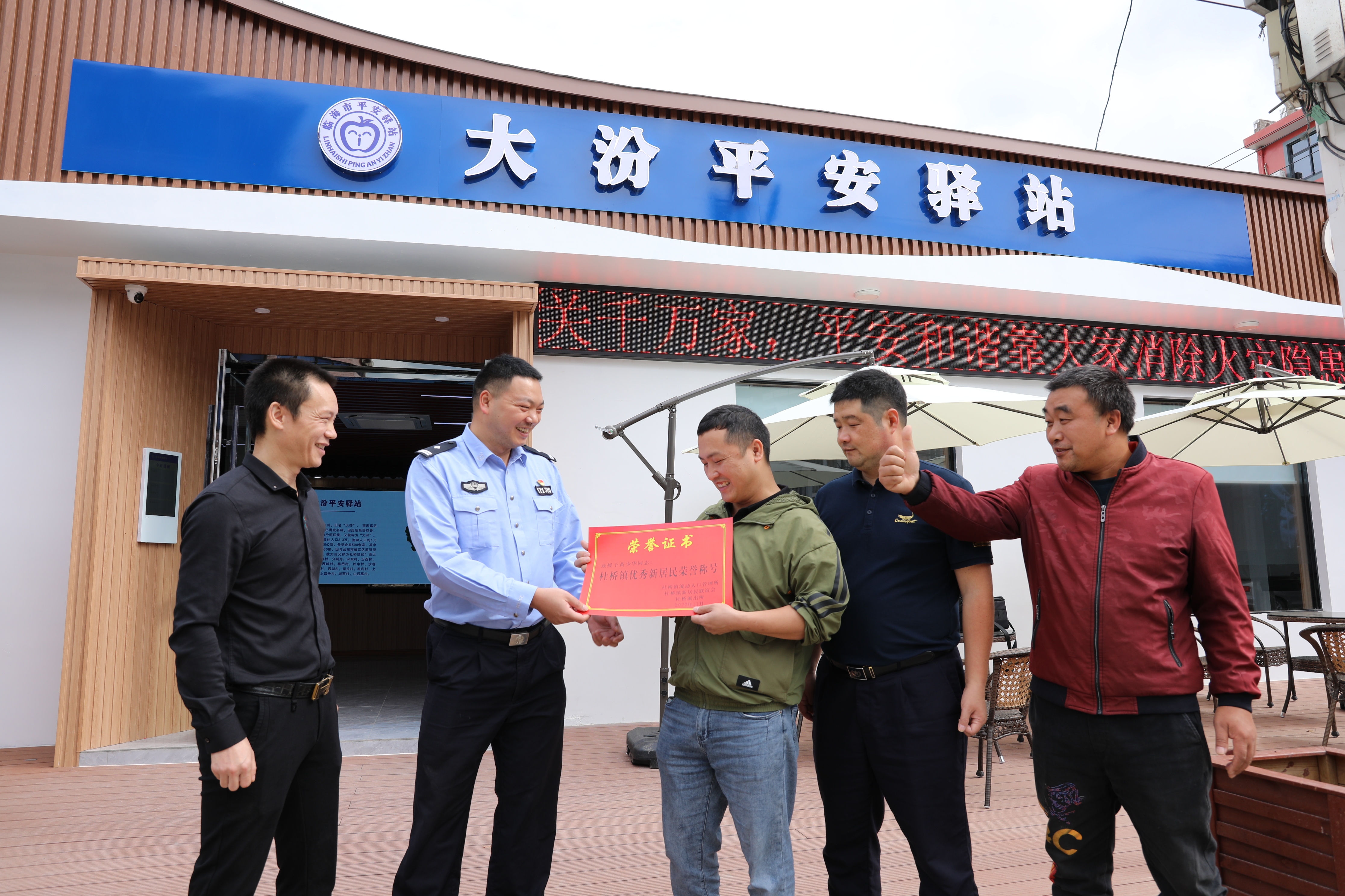 11月1日上午,临海市公安局杜桥派出所会同镇政府和新居民联谊会相关负责人,到大汾平安驿站给湖南籍新居民黄少华授予杜桥镇优秀新居民荣誉证书。10月15日早上,黄少华快速有效处置了一起居民厨房起火的火情。
