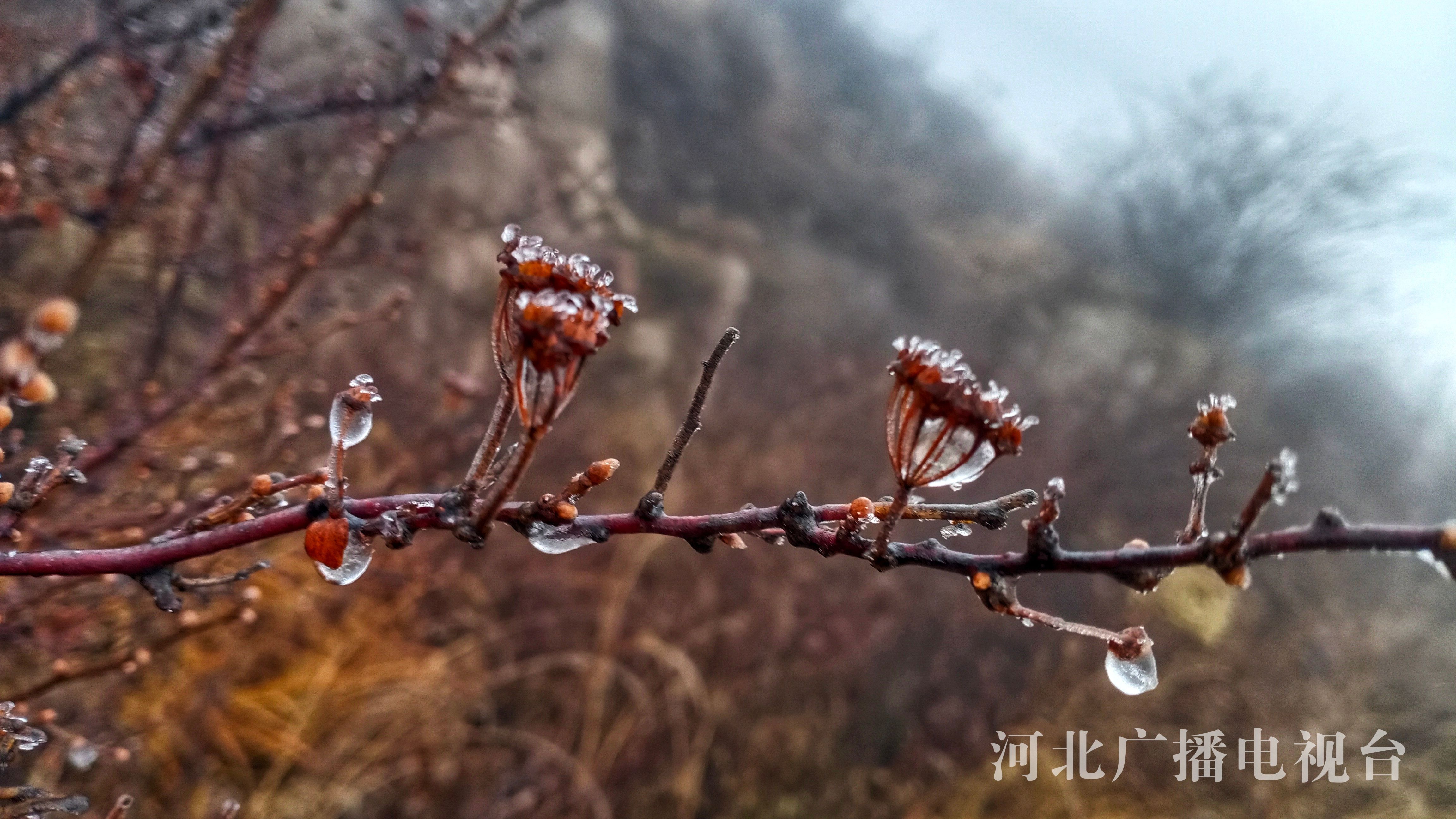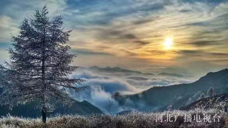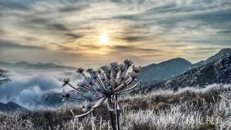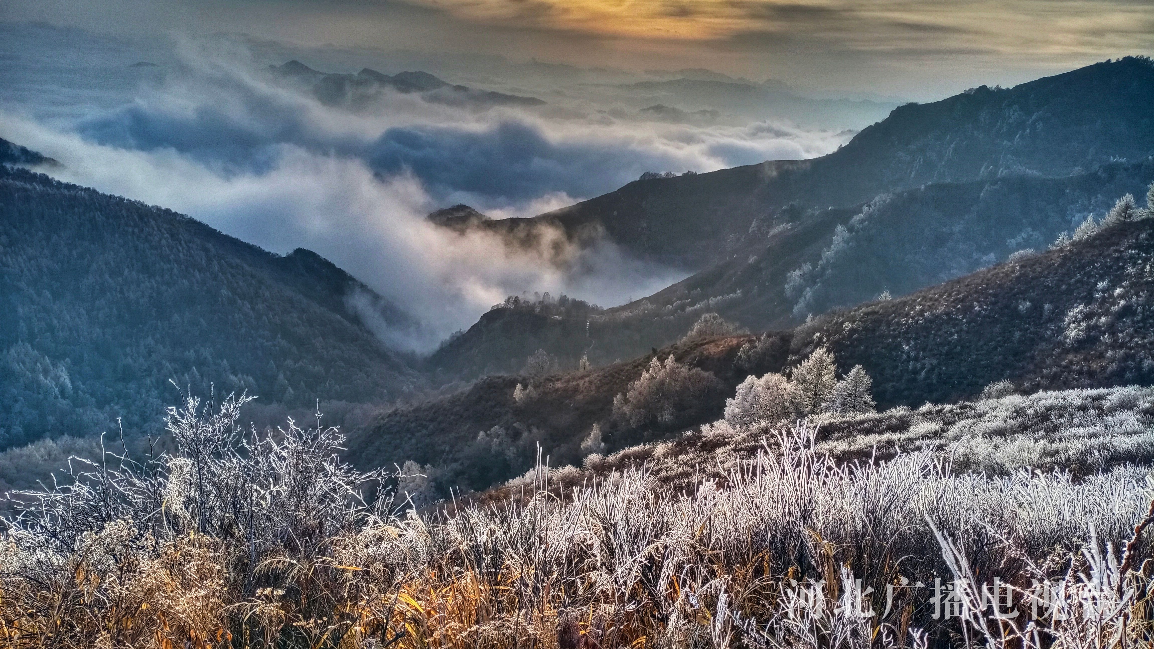 同样在今天,驼梁云顶的峰顶出现了雾凇景观,树枝草干上凝冻的白色冰晶沉积物把驼梁峰顶打扮得银光闪烁,美丽动人,把人们带进如诗如画的仙境。