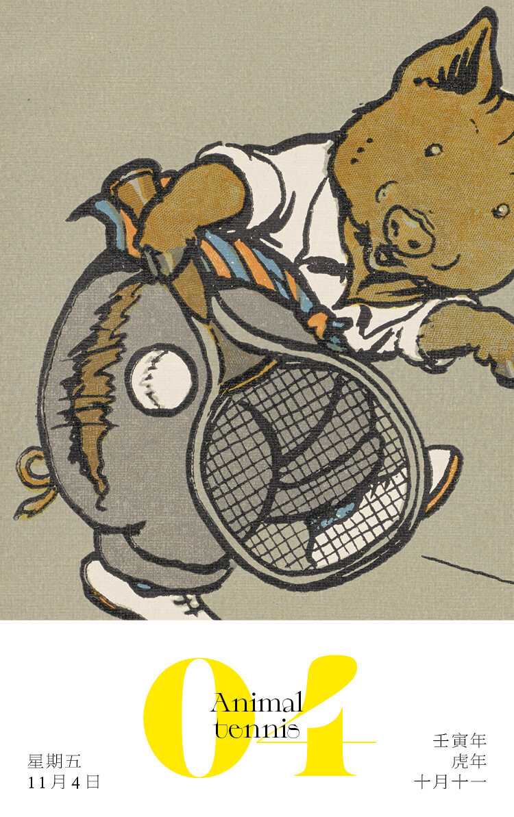 这幅插图出自《塞西尔·奥尔丁的欢乐派对》,描绘的是一只拟人化的小猪,手持网球拍,侧身跑动接球的生动场景。