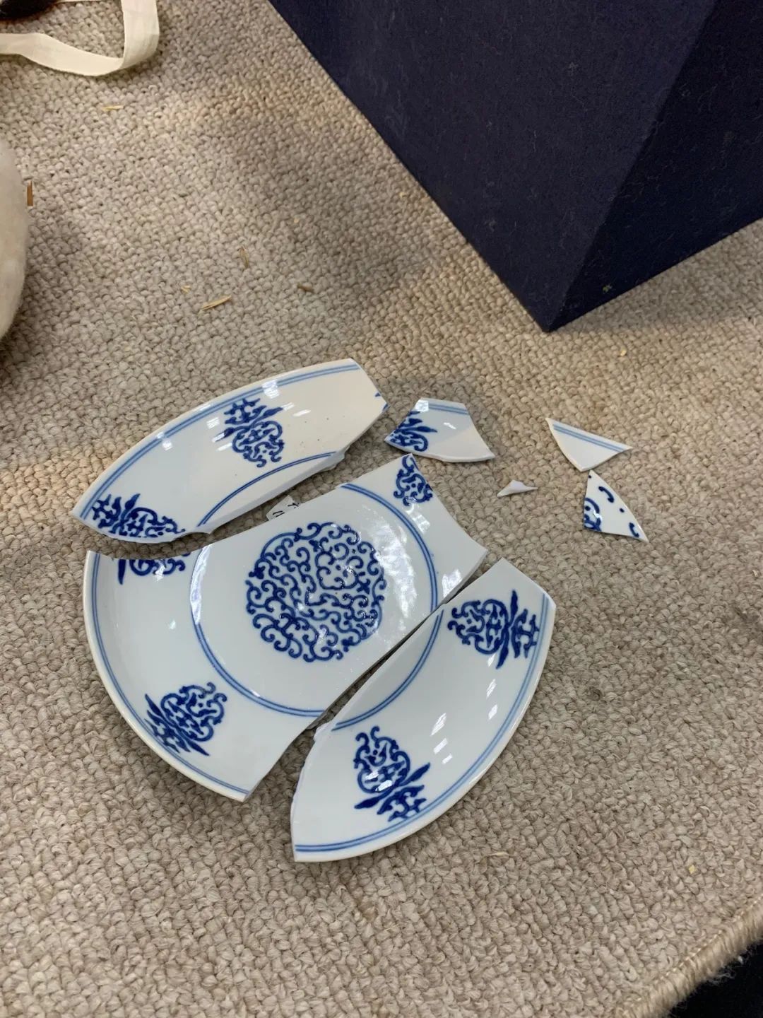 另一位工作人员误以为6件文物都已取出,发现锦盒里的布有些脱落,想把布黏上时将锦盒翻过来,导致两件文物掉出,其中一个当时接住了,“清乾隆青花花卉盘”没接住就破损了。