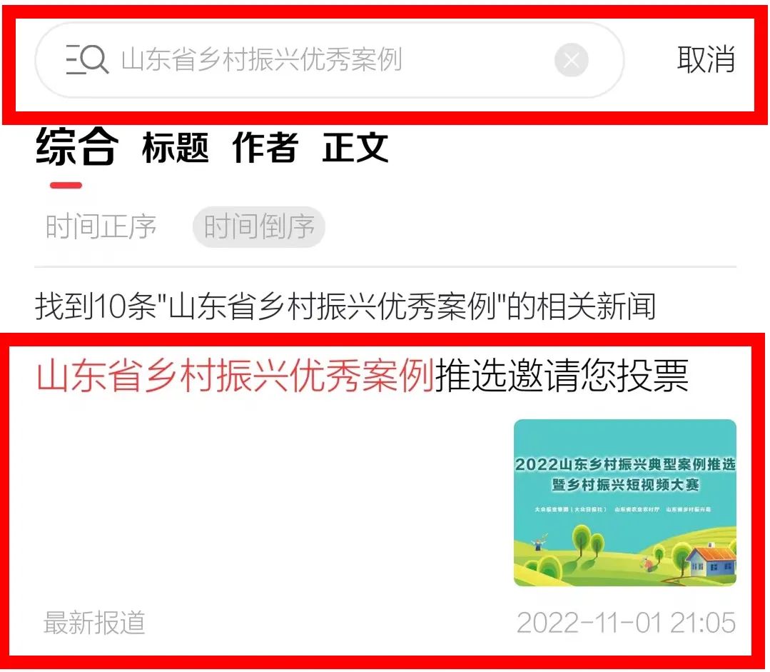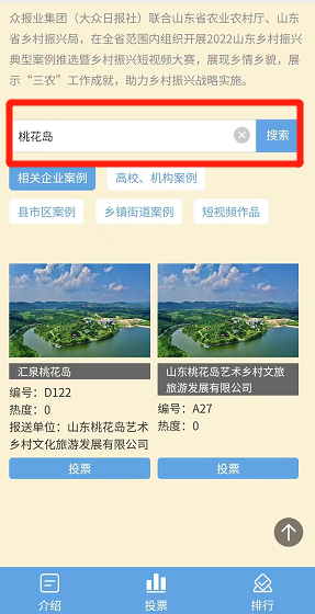 打开手机“大众日报”APP后,在搜索栏填写“山东省乡村振兴优秀案例”进入投票页面进行投票,在搜索框内输入“桃花岛”点击查找,每天最多可以投五票。(投票活动时间:2022年11月2日00:00—2022年11月7日23:59)