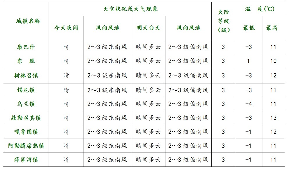 预计今天夜间到明天白天,鄂尔多斯市晴间多云,2~3级东南风转偏南风,最低气温-4~1℃,最高气温10~13℃。