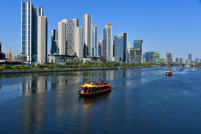游船驶过位于北京市通州区的运河商务区。(无人机照片 新华社发)