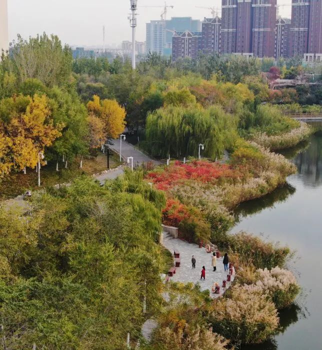 市民在滨河公园内赏秋景