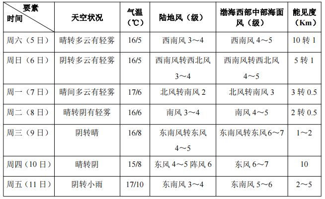 据滨海新区气象局消息,预计11月5日至11日,冷空气势力较弱,天气阴晴相间,6日至9日大气扩散条件较差,部分时段会出现轻度污染。5日至8日新区夜间能见度较低,有轻雾局地有大雾。6日和9日阴天,11日至12日有小雨。本周最高气温15~17℃、最低气温5~10℃。