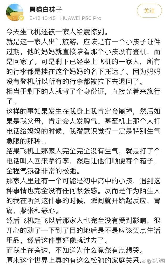 它源于博主@黑猫白袜子发的一则微博,记录了他坐飞机旅游见到的一家人,处理突发事件时的淡定平和。