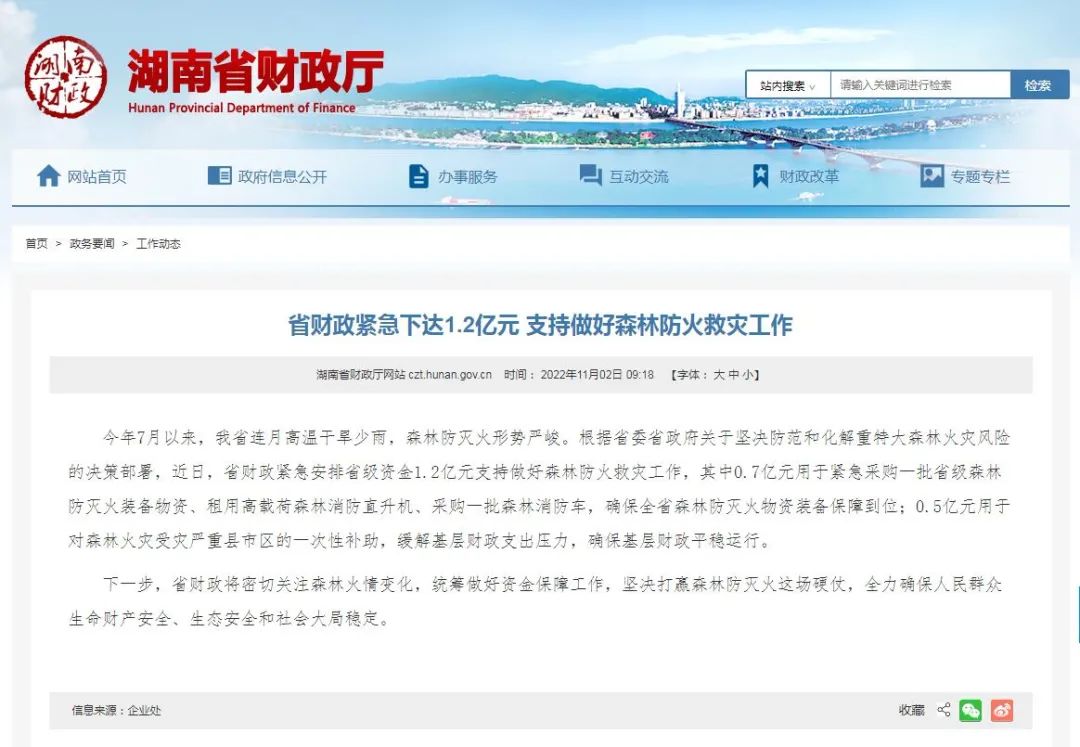 湖南省财政近日紧急安排省级资金1.2亿元,支持做好森林防火救灾工作。