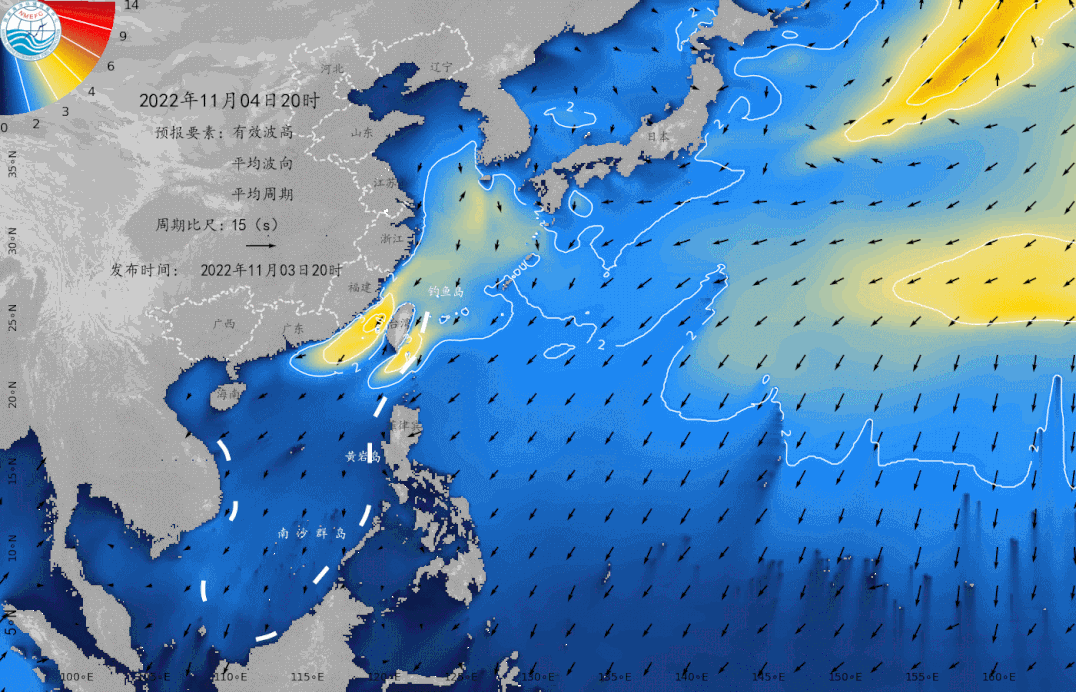 (2)受冷高压和低压倒槽的配合影响,预计11月8~10日,东海南部、钓鱼岛附近海域、台湾海峡、南海北部将出现2到3.5米的中浪到大浪区。