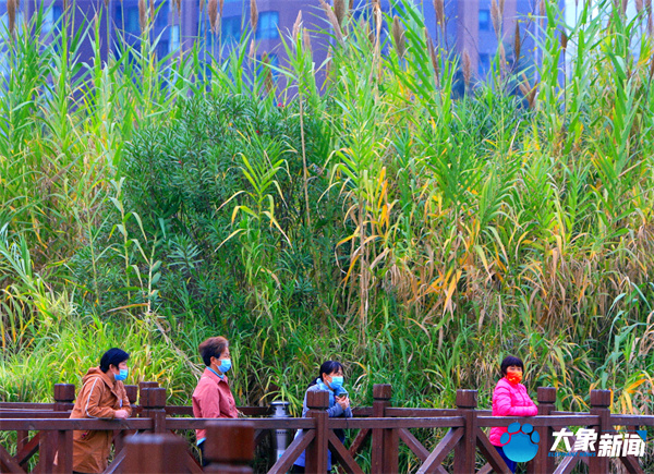 波光粼粼的水面上,各种水鸟或贴水飞翔,振翅飞翔,或自由自在地在绿洲浅滩上休憩觅食,吸引了很多孩子,良好的生态环境让这些生灵悠然栖息,构成了人与自然和谐共生的城市景观。最美的当属湖心那一丛丛的芦苇,清风拂过,芦花摇曳,似云雾如飞雪。芦苇与落叶相映衬,既有秋色斑斓,又透露着初冬深秋的安详宁静。