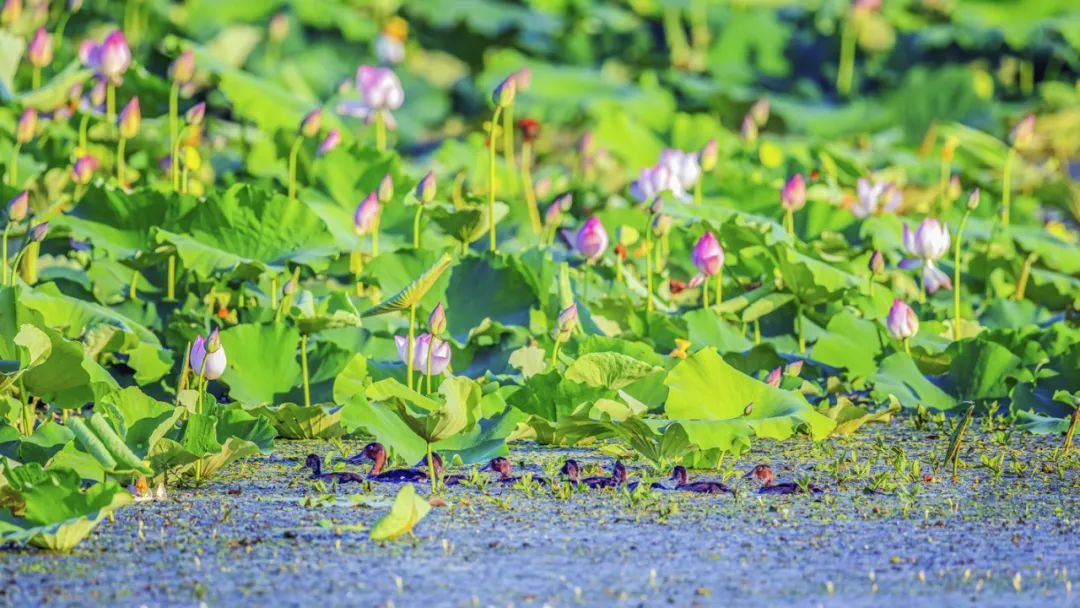 府河,荷花从中青头潜鸭游过 魏斌 摄