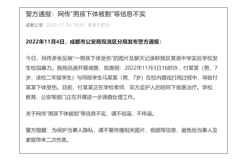 关于网传“男孩下体被割”等信息不实,请不信谣,不传谣。警方提醒:为保护当事人隐私,请不要传播相关图片、视频等信息,避免给当事人及家庭带来二次伤害。