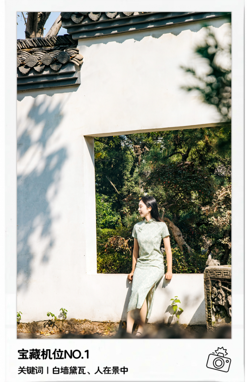 提示:白墙黛瓦,含蓄静美,方形的空窗仿佛一个画框将园林景观框入其中。此时,何不做个画中人,轻轻坐在窗檐,不用刻意摆姿势,只是静坐着便会和景融为一体。