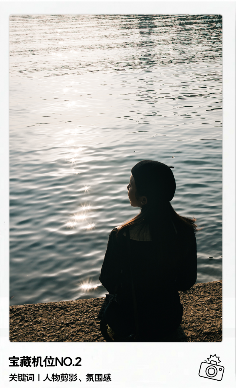 提示:天气晴朗时,水面上的光影是非常好的拍照素材。构图时以水面为背景,让画面足够干净,人物可以静坐也可以站立,保持松弛的状态最好啦。建议大家选择日落前进行拍摄,使用相机的朋友用M档与A档均可,根据环境调节光圈大小。