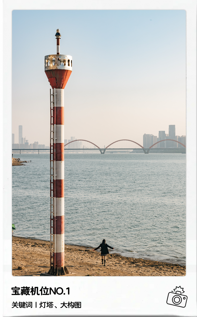 提示:灯塔是江边氛围感照片拍摄的灵魂素材。建议选择一处地势较高,距离较远的地点,将灯塔全部带出,建议有留白空间,人物可以出镜为画面增添丰富感与故事感。