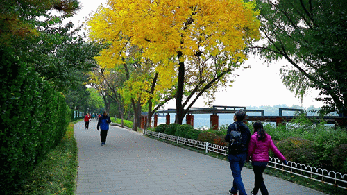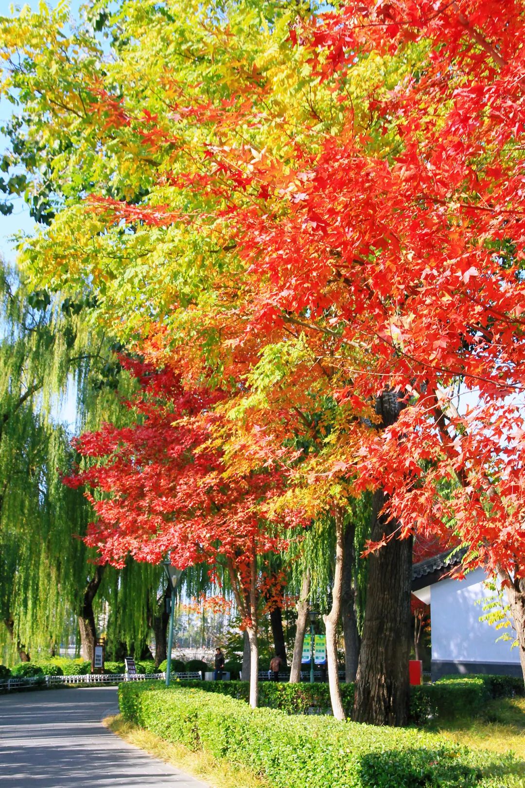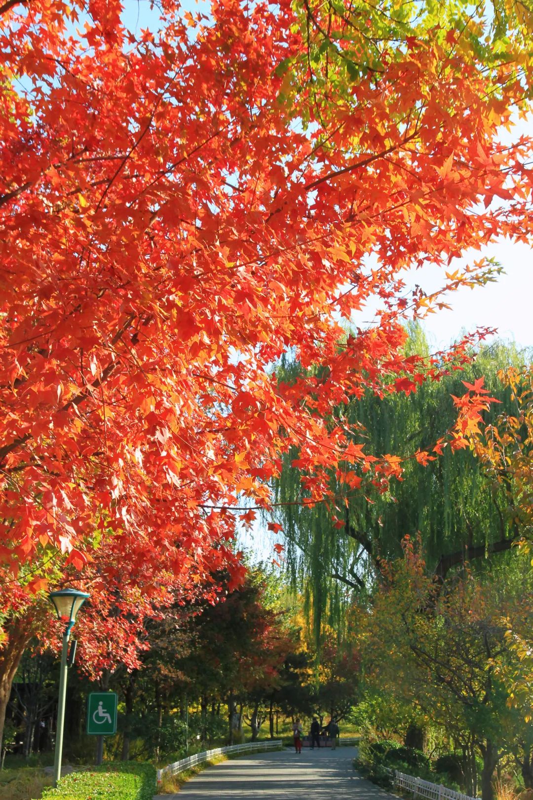 位于公园东湖北岸的遐观园景区,沿路的丽红元宝枫与原有的银杏、白蜡、水杉、樱花、天目琼花等,搭配观干的红瑞木、金枝槐,观果的各类海棠交织在一起,错落有致的观赏带,构成一道独具特色的风景线。