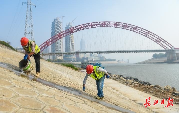 长江日报大武汉客户端11月4日讯(记者宋磊 通讯员郭育军)“目前汉江正值罕见低水位,正是护岸抢修黄金期,我们要尽快完成任务。”11月4日上午,硚口区水务局堤防科负责人张坚正在沿河大道宝庆闸口堤防上巡查修复工程。近日,在武汉市水务局统一部署下,武汉市各区水务部门正在抓紧当前枯水期,开展两江四岸堤防设施修复工作。