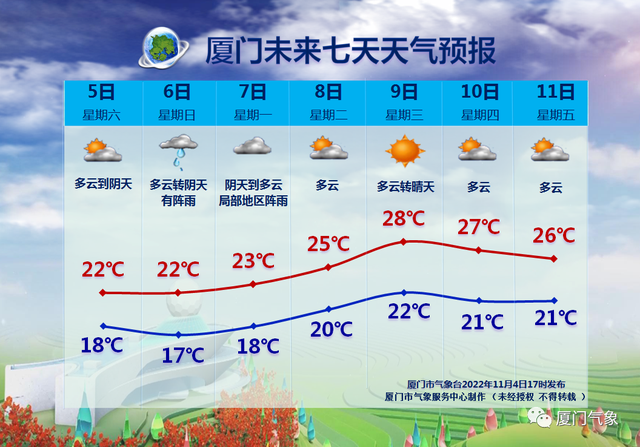 冷空气如约而至,昨天鹭岛天空阴沉,气温低迷。气象部门预测,今起三天,我市以多云天气为主,气温不高,明后天还会出现阵雨,市民出行需要带把伞。