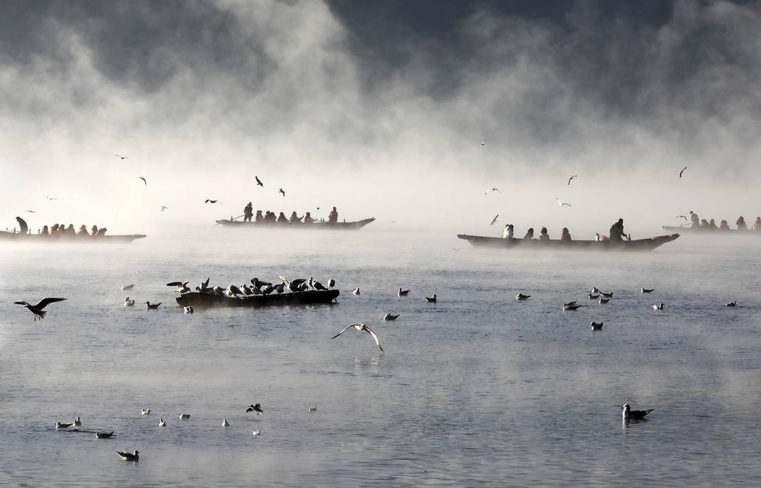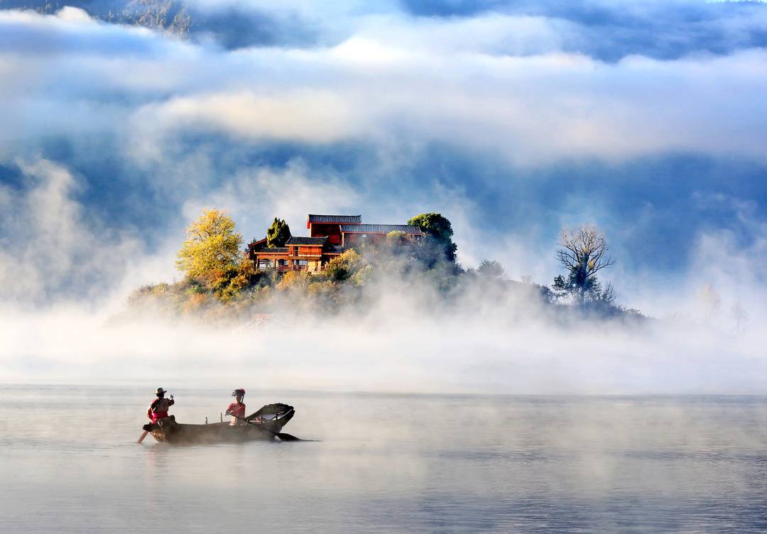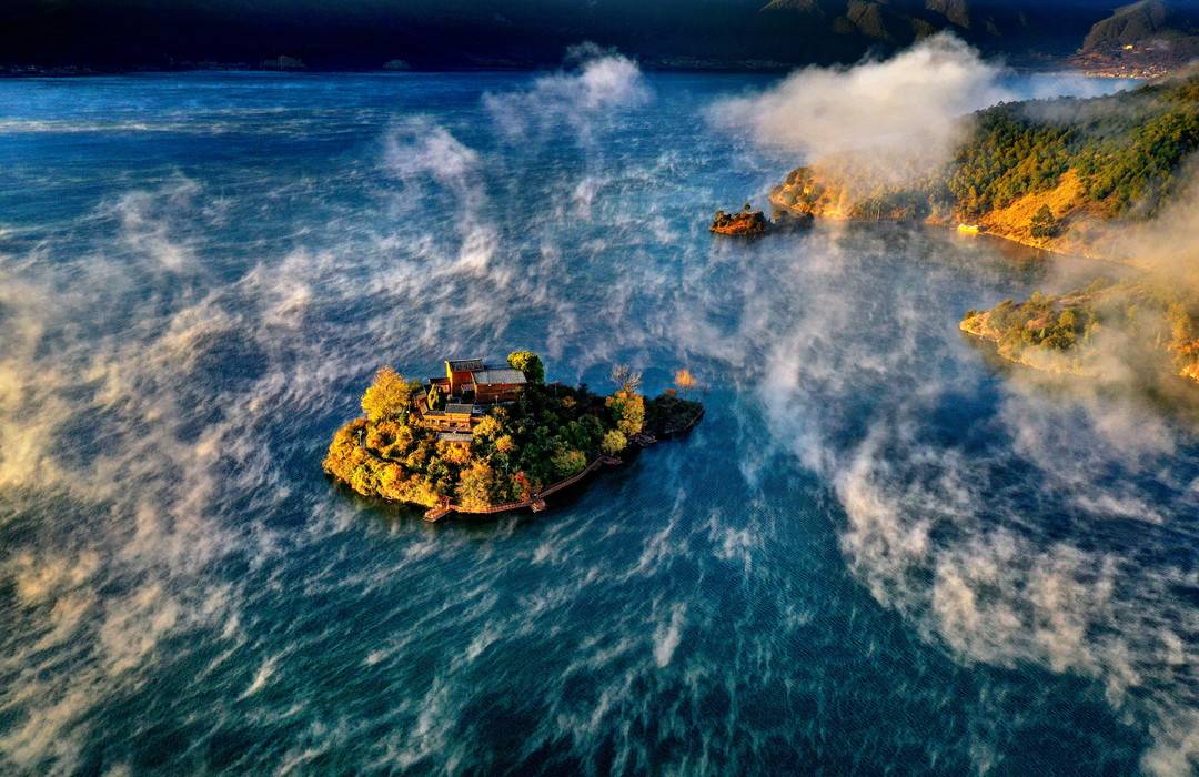 冬季,俯瞰笼罩在升腾的水雾中的王妃岛,极似一只大龟 盐源县委宣传部供图,刘映平拍摄