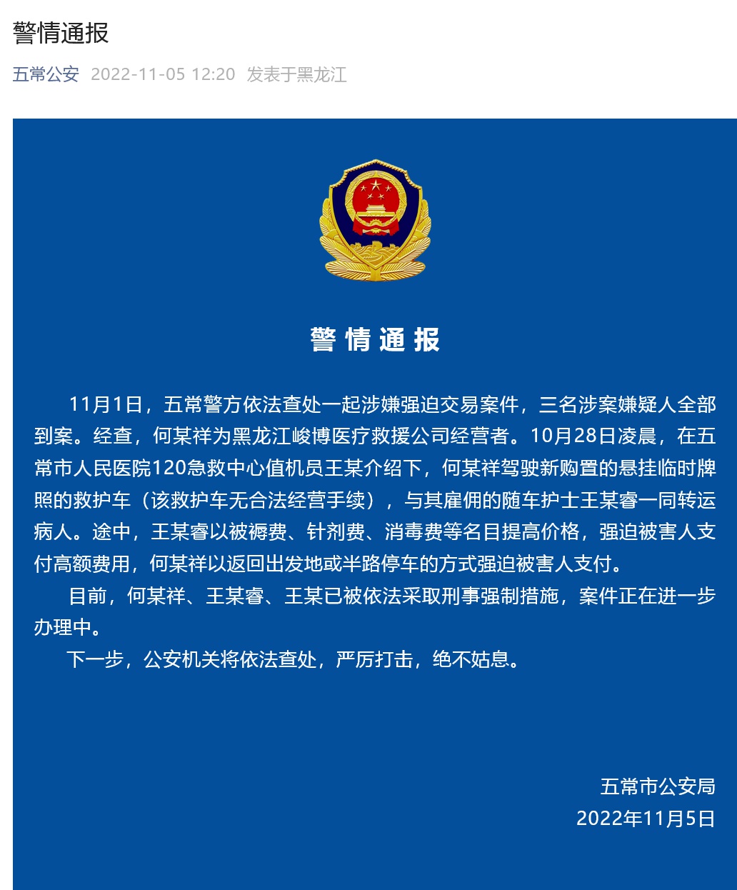 11月5日,五常市公安局发布警情通报,11月1日,五常警方依法查处一起涉嫌强迫交易案件,三名涉案嫌疑人全部到案。经查,何某祥为黑龙江峻博医疗救援公司经营者。10月28日凌晨,在五常市人民医院120急救中心值机员王某介绍下,何某祥驾驶新购置的悬挂临时牌照的救护车(该救护车无合法经营手续),与其雇佣的随车护士王某睿一同转运病人。途中,王某睿以被褥费、针剂费、消毒费等名目提高价格,强迫被害人支付高额费用,何某祥以返回出发地或半路停车的方式强迫被害人支付。