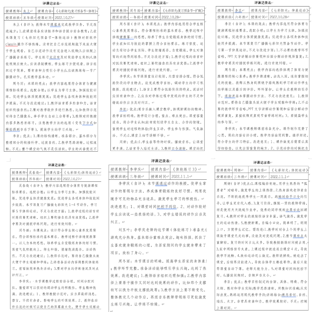 每节课后老师们及时开展以线上课为例的评课活动。活动结束后全组教师对线上体育课教学情况做出分析反馈、总结线上教学存在的问题及经验并及时整改。