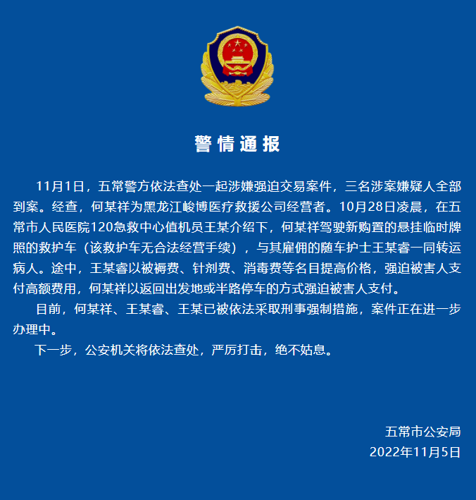 据五常公安微信公众号11月5日消息,11月1日,五常警方依法查处一起涉嫌强迫交易案件,三名涉案嫌疑人全部到案。经查,何某祥为黑龙江峻博医疗救援公司经营者。10月28日凌晨,在五常市人民医院120急救中心值机员王某介绍下,何某祥驾驶新购置的悬挂临时牌照的救护车(该救护车无合法经营手续),与其雇佣的随车护士王某睿一同转运病人。途中,王某睿以被褥费、针剂费、消毒费等名目提高价格,强迫被害人支付高额费用,何某祥以返回出发地或半路停车的方式强迫被害人支付。