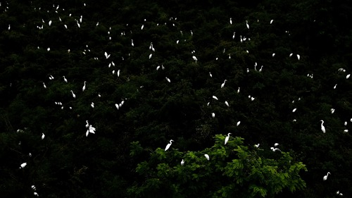 在盐城东部沿海的大丰麋鹿国家级自然保护区,一群白鹭在树顶栖息。新华社记者李响摄