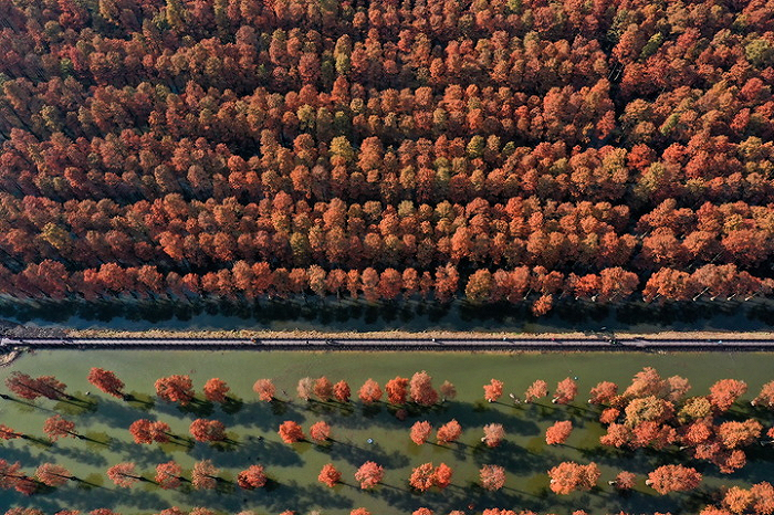 武汉涨渡湖湿地公园“水上森林”色彩斑斓。新华社发(赵军摄)