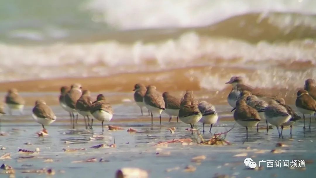 这只脚上带着“0L”标志的勺嘴鹬还不到半岁,这是它首次迁飞,小家伙在防城港的海滩上吃饱喝足后,开始尽情玩耍,只见它用翅膀不停地拍打海水,似乎好像特别享受这样的动作,一副没见过世界的样子,身子时不时地浸泡在海水里,用那扁扁的小勺子嘴梳理后背和翅膀。在海滩上一会跑这一会跑那,一切对它来说都是那么的新奇,它的样子实在太萌逗了,旁边的候鸟也被吸引,凑过来跟着它的节拍一起做动作,几只鸟儿在海滩上一起撒娇卖萌。