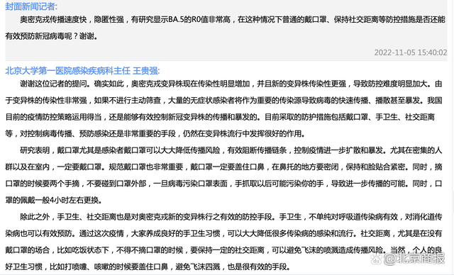 11月5日下午,国务院联防联控机制就科学精准做好疫情防控有关情况举行发布会。会上,有媒体提问,奥密克戎传播速度快,隐匿性强,有研究显示BA.5的R0值非常高,在这种情况下普通的戴口罩、保持社交距离等防控措施是否还能有效预防新冠病毒呢?