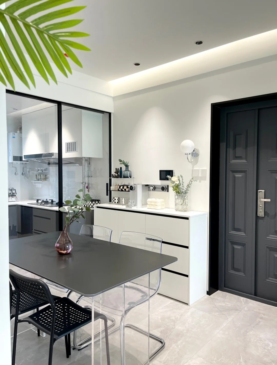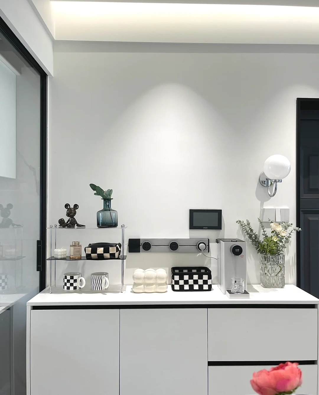 餐厅不盲目地做满墙的餐边柜,做半柜,90厘米的高度使用顺手,深度含门35厘米,不会占太多餐厅的空间,边柜能充当水吧使用,安装轨道插座方便小电器使用,搭配摆件就是一个精致的入户展示区,摆了一款亚克力置物架,磨砂材质高级感满满。