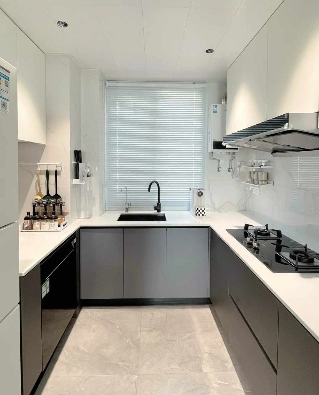 U型厨房真是显大又实用的典范,动线按照拿-洗-切-炒-盛来设计,小空间处理的非常舒服~