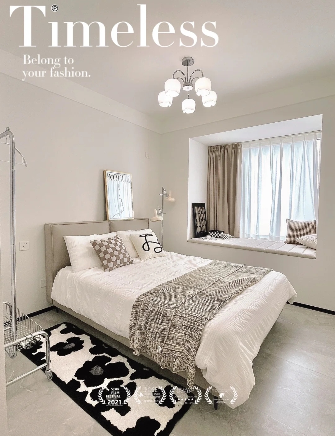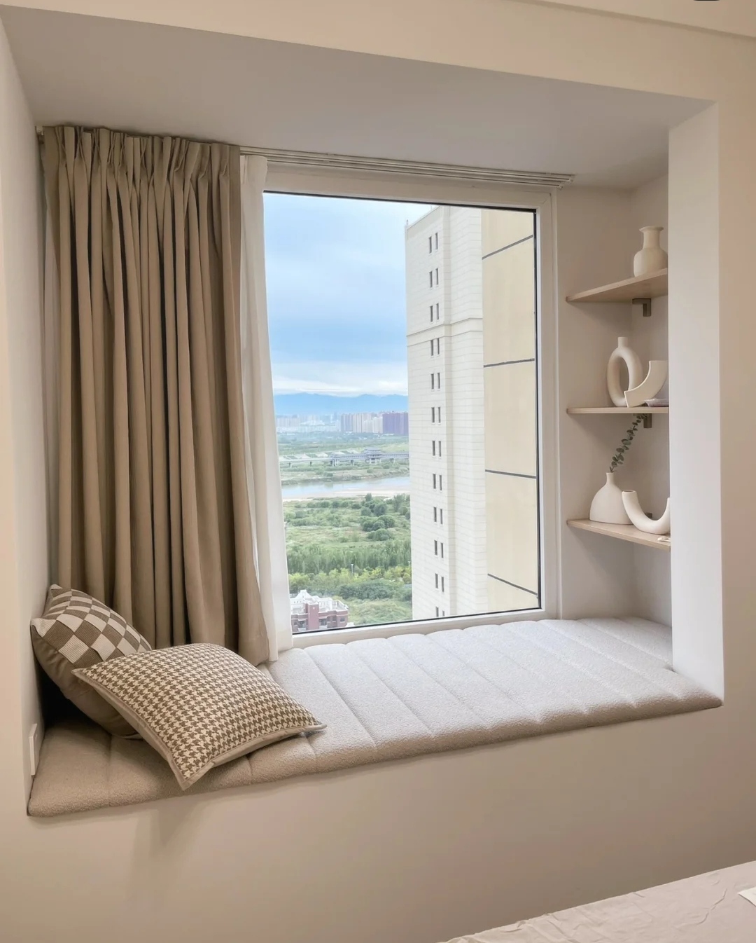 飘窗上定制了很厚实的奶茶色垫子,泰迪绒的手感很舒服。而且屋主家飘窗有拐角,定制也可以根据飘窗形状设计,铺上后严丝合缝,非常简约好看~窗帘选择了纱帘+布帘,同样选择了奶茶色的窗帘,白天卧室遮一点光,氛围感就来了