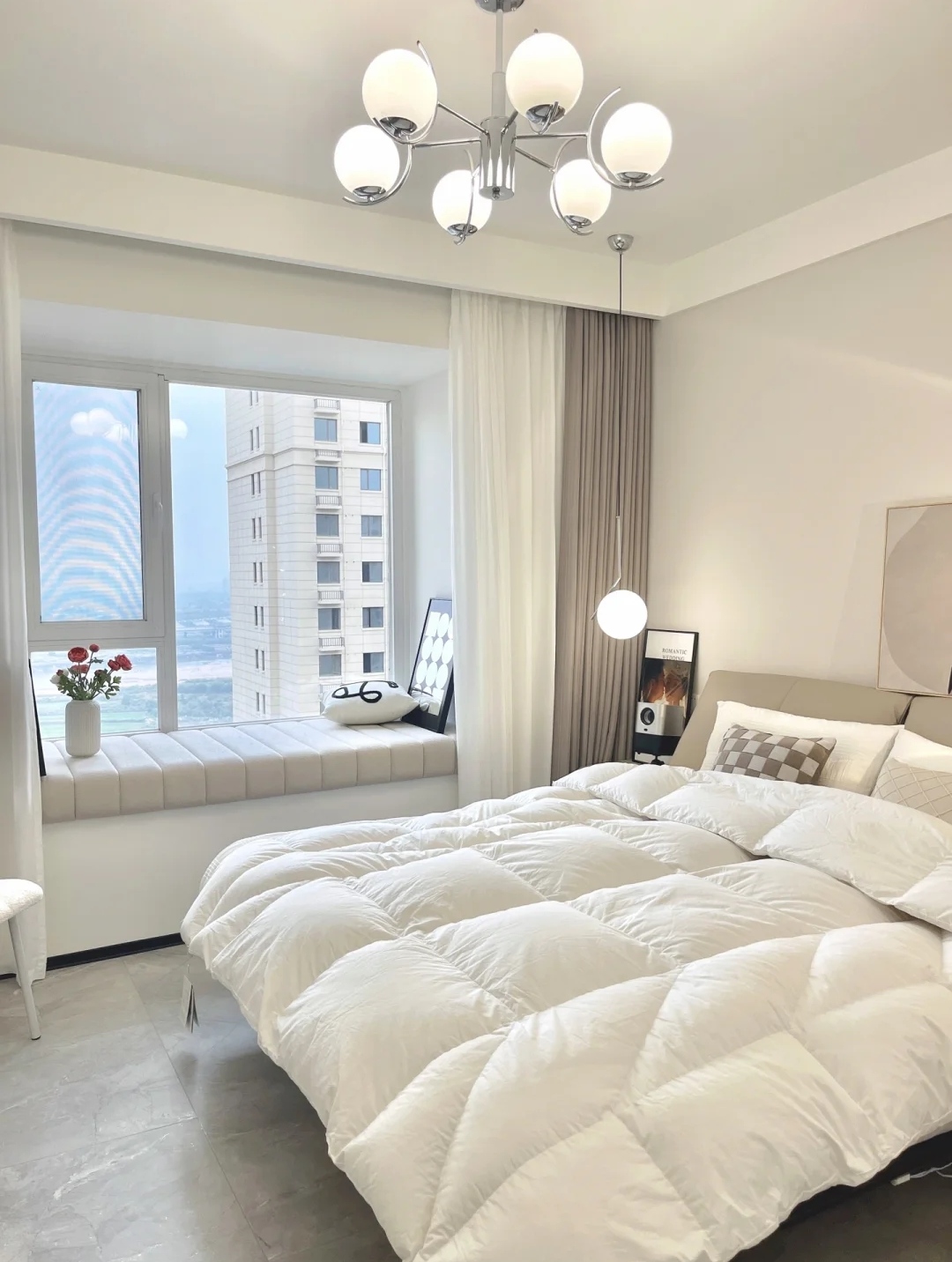 预算有限,没有做卧室无主灯,只做了一圈22cm 宽的单眼皮石膏板吊顶,一样大气很好看,由于这间卧室由于面积太小了,就没有留窗帘盒。卧室吊灯选择了一款造型简洁的郁金香吊灯,灯光柔和不刺眼,温馨感十足。
