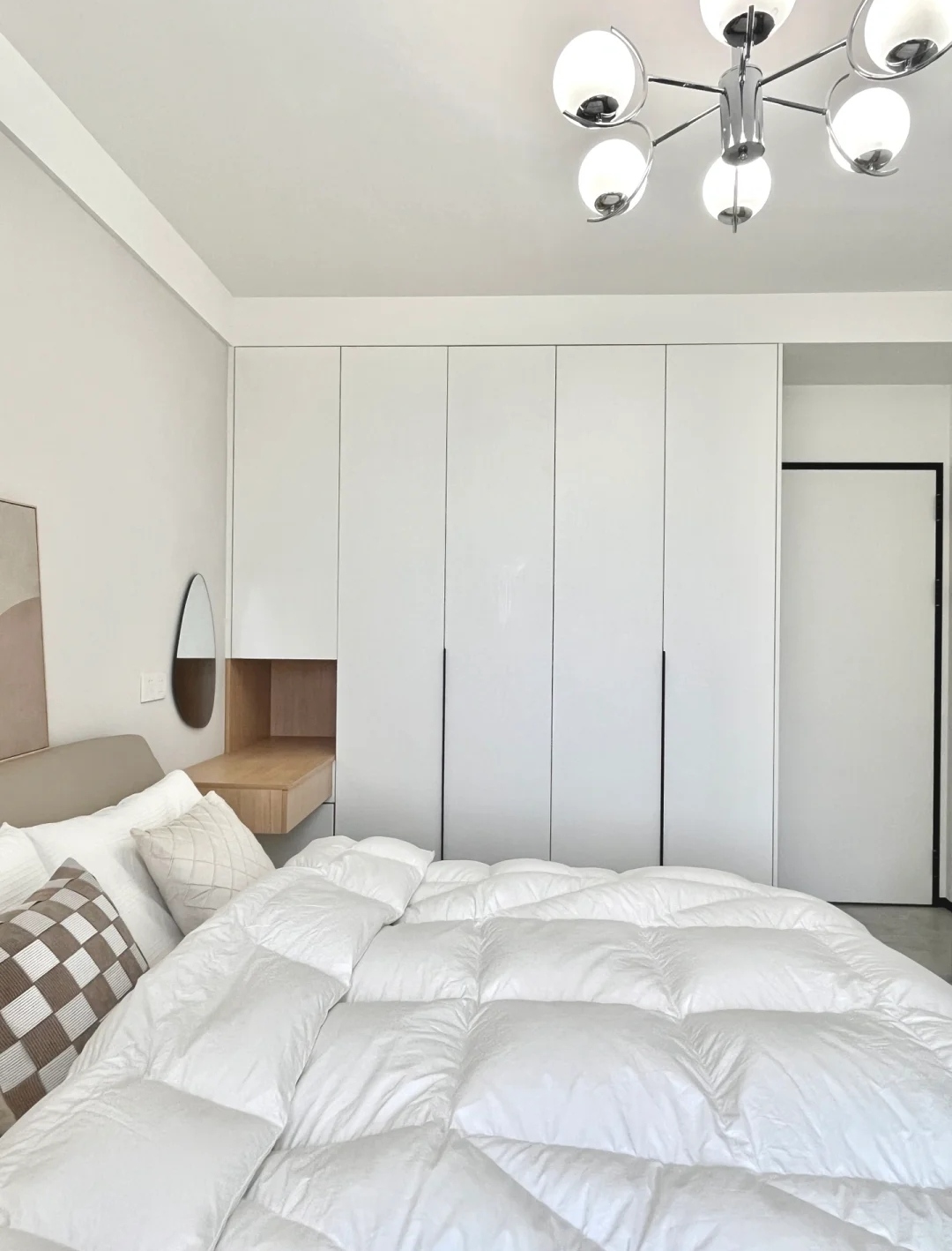 柔光砖通铺,延伸感强,卧室更宽敞,柜子是肤感白柜门搭配原木色梳妆台,简单又耐看。