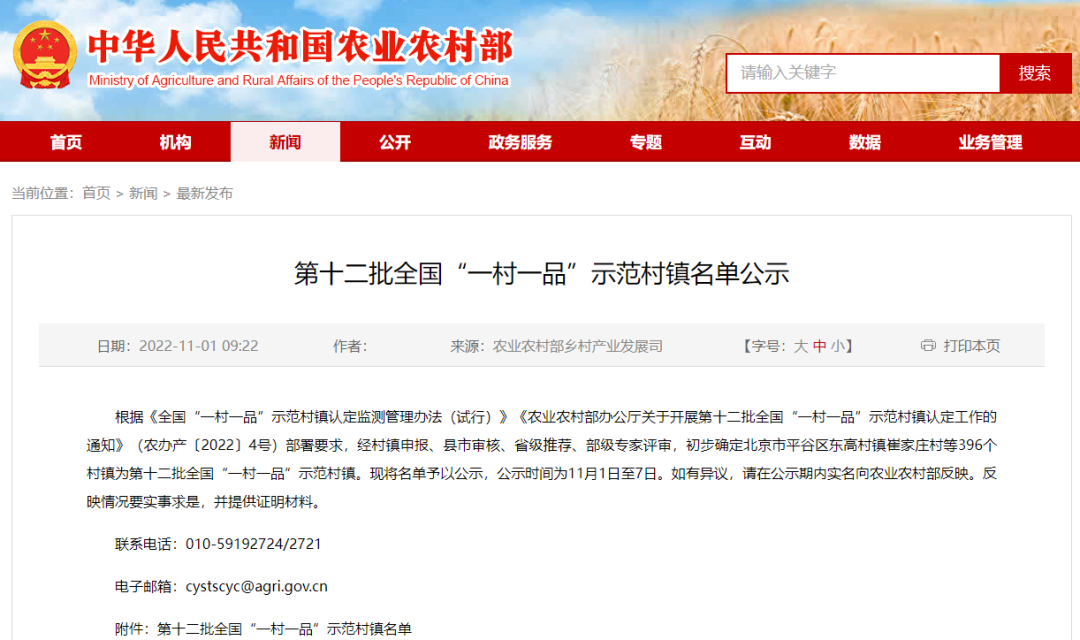 根据《全国“一村一品”示范村镇认定监测管理办法(试行)》《农业农村部办公厅关于开展第十二批全国“一村一品”示范村镇认定工作的通知》(农办产〔2022〕4号)部署要求,经村镇申报、县市审核、省级推荐、部级专家评审,初步确定北京市平谷区东高村镇崔家庄村等396个村镇为第十二批全国“一村一品”示范村镇。现将名单予以公示,公示时间为11月1日至7日。如有异议,请在公示期内实名向农业农村部反映。反映情况要实事求是,并提供证明材料。