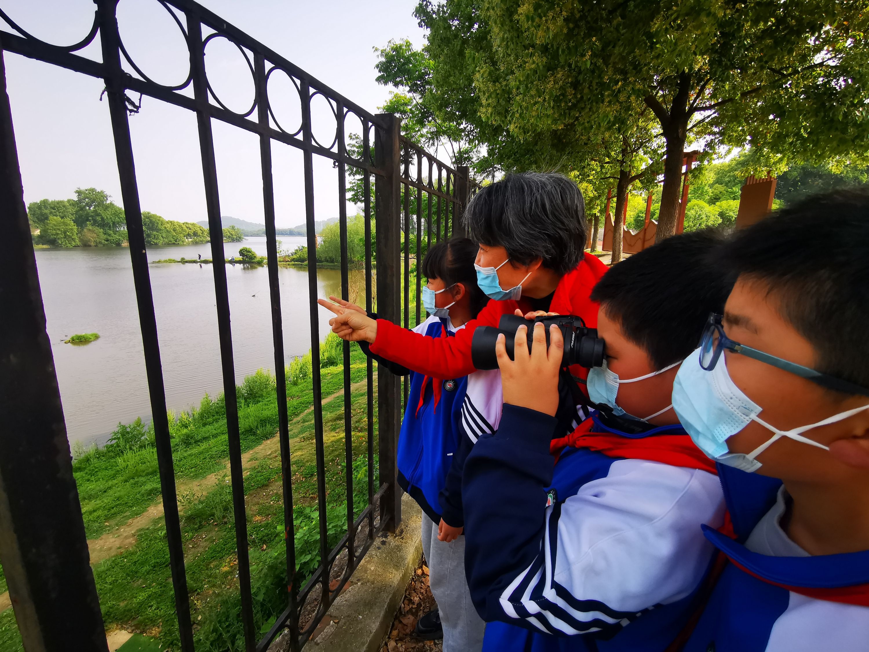 青山区武东小学师生在校园里观鸟。资料图,通讯员黄修杰 摄