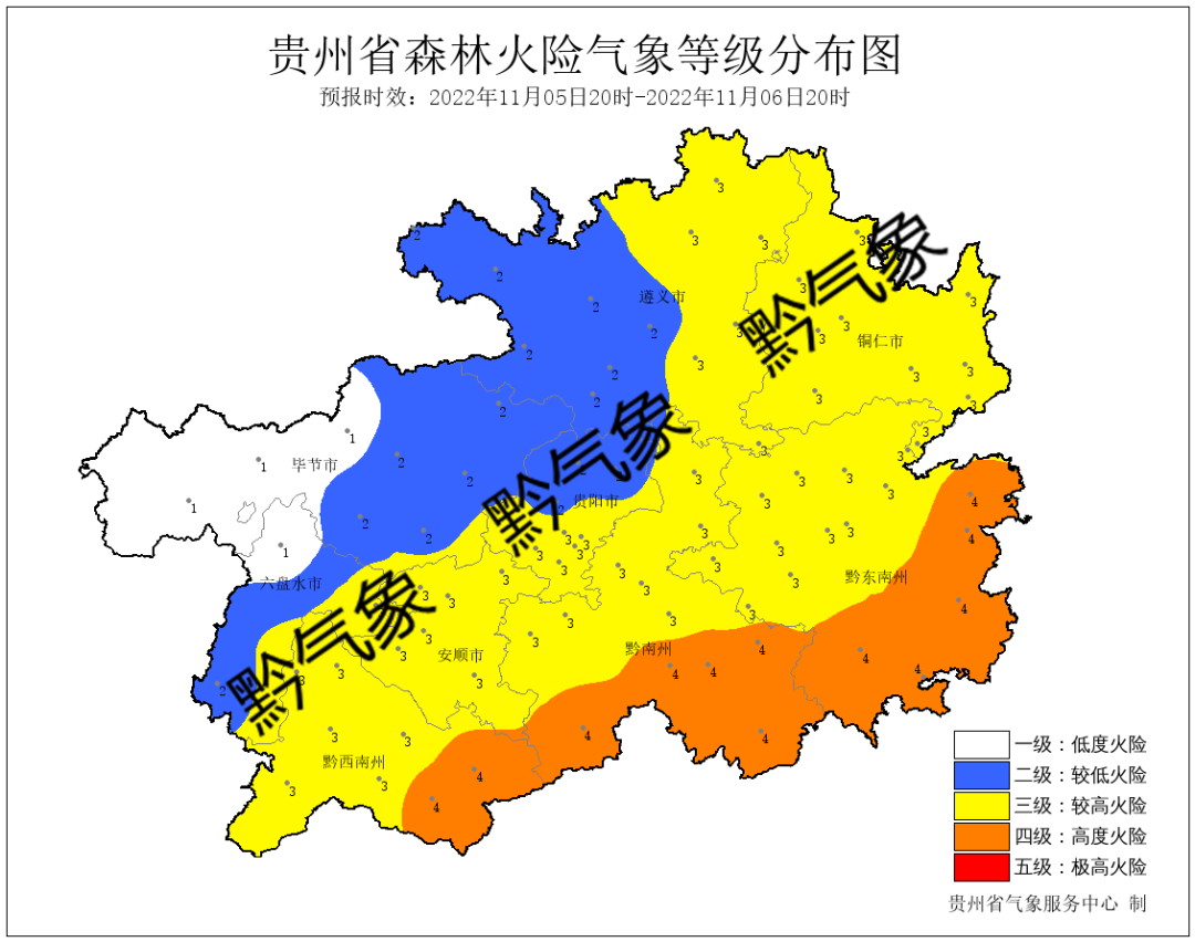 2022年11月05日20时-11月06日20时:省的中部以南以东地区森林火险气象等级为3-4级,危险程度较高或高,其余地区森林火险气象等级为1-2级,危险程度低或较低。