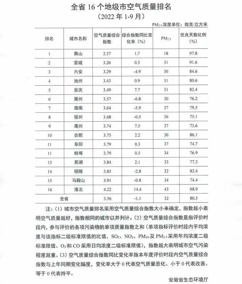 日前,安徽省生态环境厅公布2022年1至9月全省16个地级市空气质量排名,黄山最好,淮北垫底。全省平均空气质量综合指数为3.56,平均优良天数比例为80.3%。六安市以84.6%的优良天数比例位列全省第三。