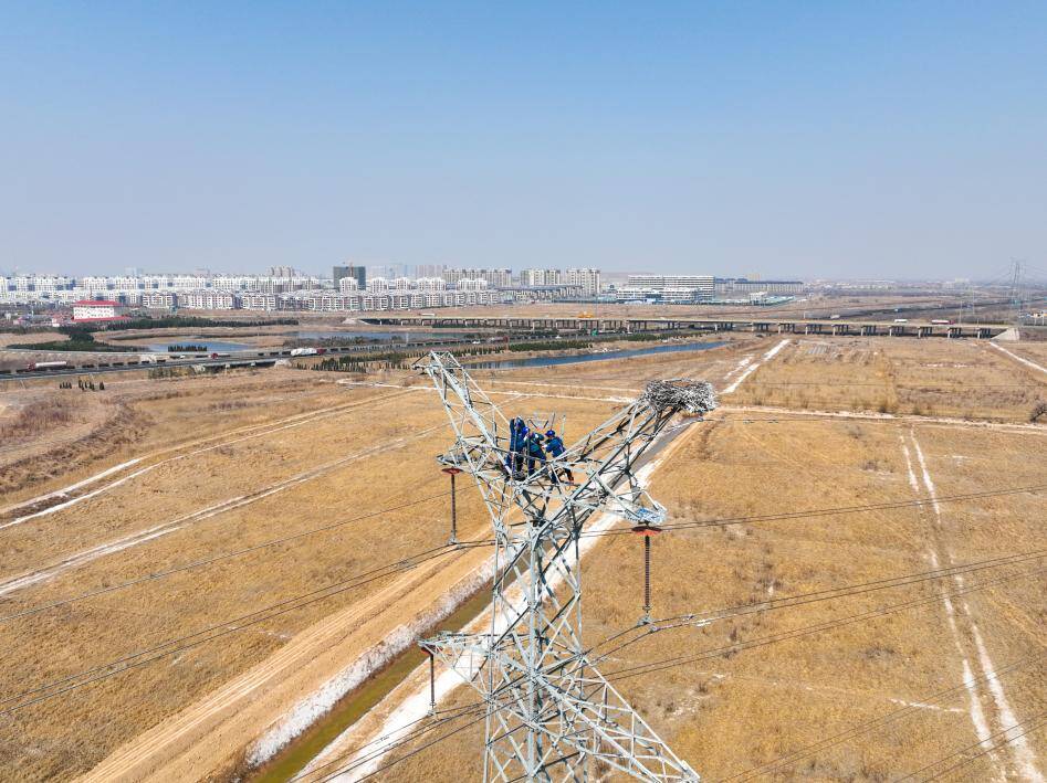在城边30多米高的输电铁塔上,东方白鹳多年前已在此安家筑巢。国网东营供电公司专门成立了“国网护线爱鸟队”,用心守护东方白鹳的“铁塔家园”。