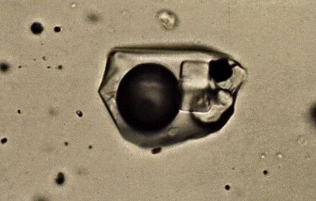 矿物中的流体包裹体。在形成后随着矿物的冷却,流体收缩形成了一个小气泡 | 图片来源:Wikipedia