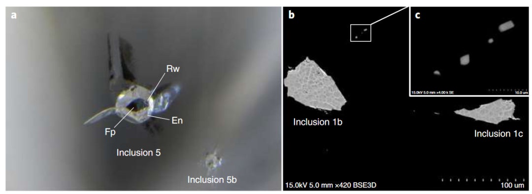 左图为钻石中的包裹体5,含有水合尖晶橄榄石(Ringwoodite,Rw)+顽火辉石(Enstatite, En)+铁方镁石(Ferropericlase,Fp),右侧包裹体1主要为顽火辉石(En)| 图片来源:参考文献