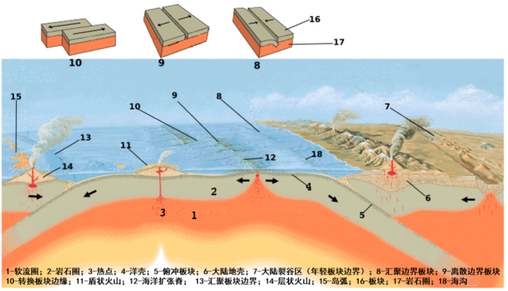 水随着俯冲的板块进入地下(标号5),在软流圈甚至更深处运动(标号1),最终伴随着火山喷发(标号3)、大洋中脊(标号12)和岛弧(标号15)回到地表 | 图片来源:Wikipedia