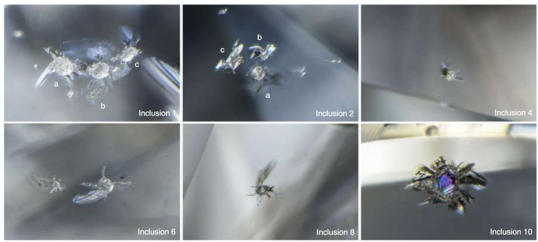经鉴定,无色透明的包裹体1(a-c)和包裹体2b、包裹体6、包裹体8为顽火辉石;包裹体2a为含有顽火辉石与尖晶橄榄石接触的双相包体,2c则可能由尖晶橄榄石转化而来;包裹体4中存在和钙钛矿的结构;包裹体10为铁方镁石。所有的包裹体,显示这颗钻石形成于富水环境中 | 图片来源:参考文献