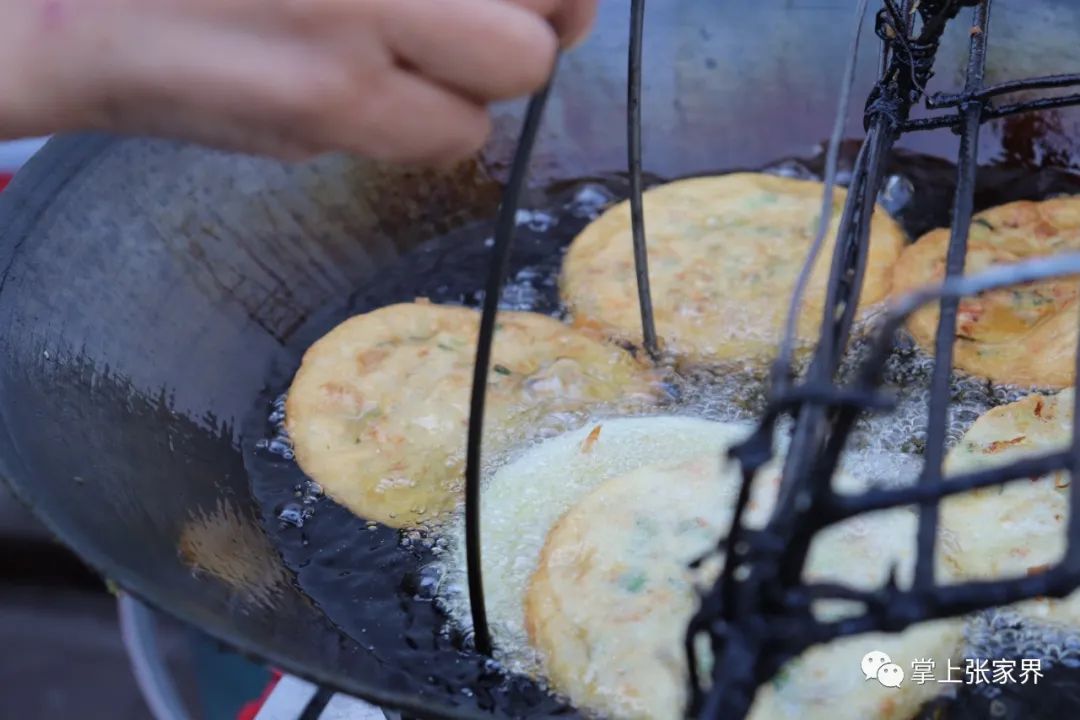 滚烫的油花瞬间将乳白色的粑粑勺包裹。高温下,热油与水浆中的糖分碰撞,浮出浅浅的焦糖香味。不一会儿,圆形的粑粑轻柔的浮出油面,金黄金黄的!
