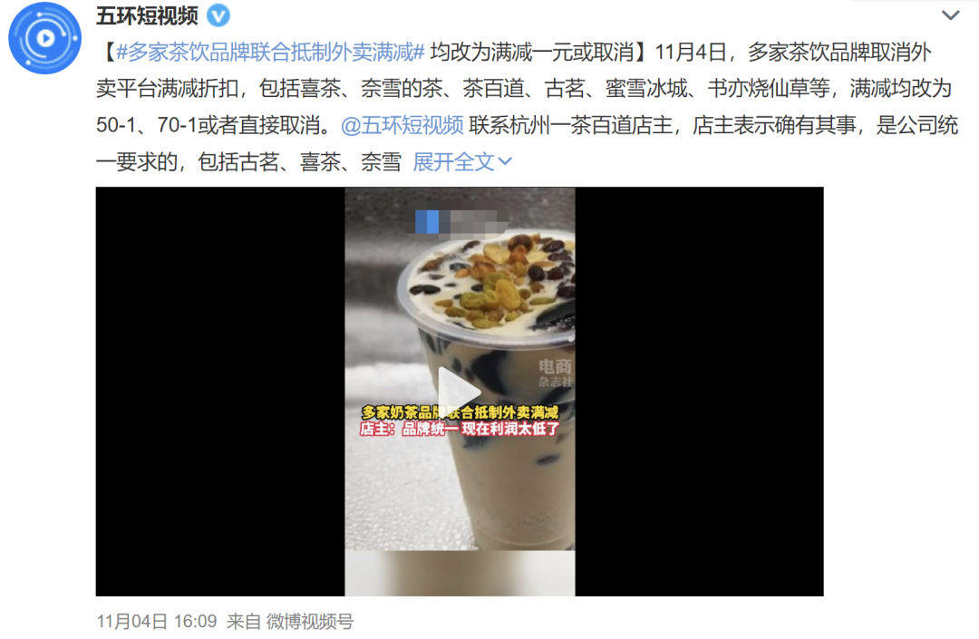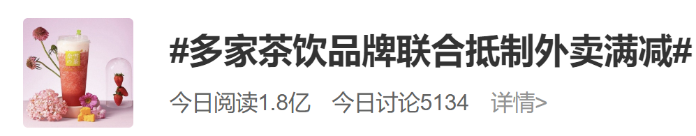 今日,#多家茶饮品牌联合抵制外卖满减#的话题登上微博热搜引发热议。