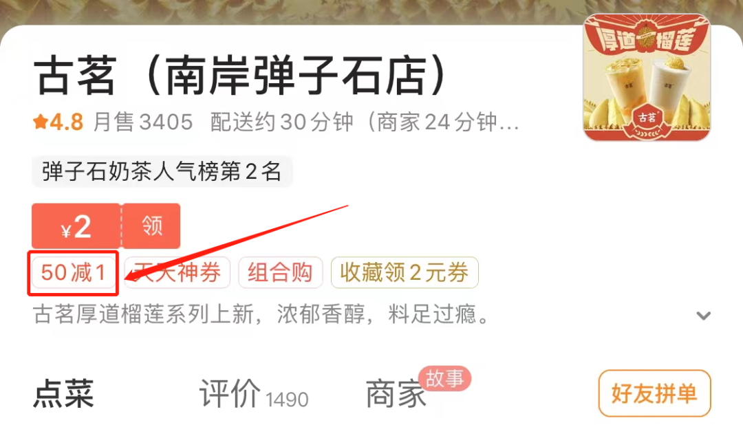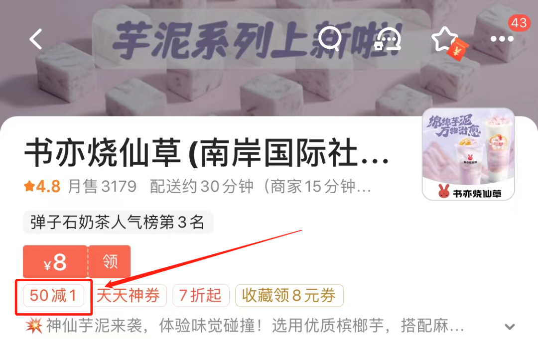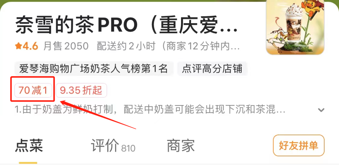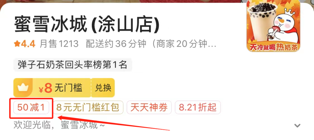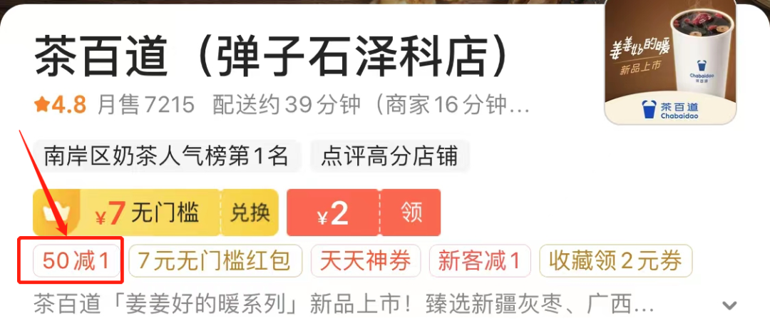 小编通过外卖平台查询附近奶茶店发现的确如此。目前,茶百道、蜜雪冰城、书亦烧仙草、古茗等满减已改为50-1,而奈雪的茶为70-1。