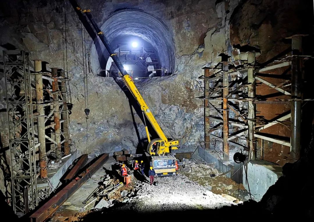 建设者们采用迂回导坑新辟架设跨越拱桥、完整水文年观测等技术手段,成功“度过”了两大溶洞。图源:“中国铁建”微信公众号